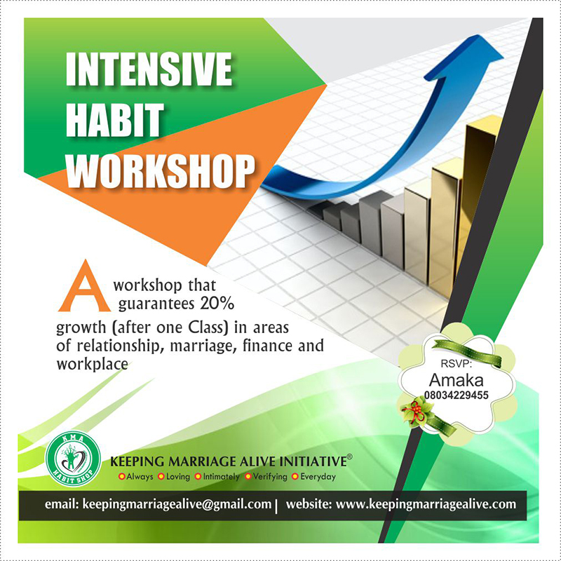 INTENSIVE HABIT WORKSHOP About Intensive Habit Workshop is a special arm of Keeping Marriage Alive Initiative that deals on habits; which when utilised properly leads to a more productive life, better relationship skills and a balanced life. Habit Workshop Series In order to fulfil our vision of raising Strong Marriages, Strong Family and a Healthier […]