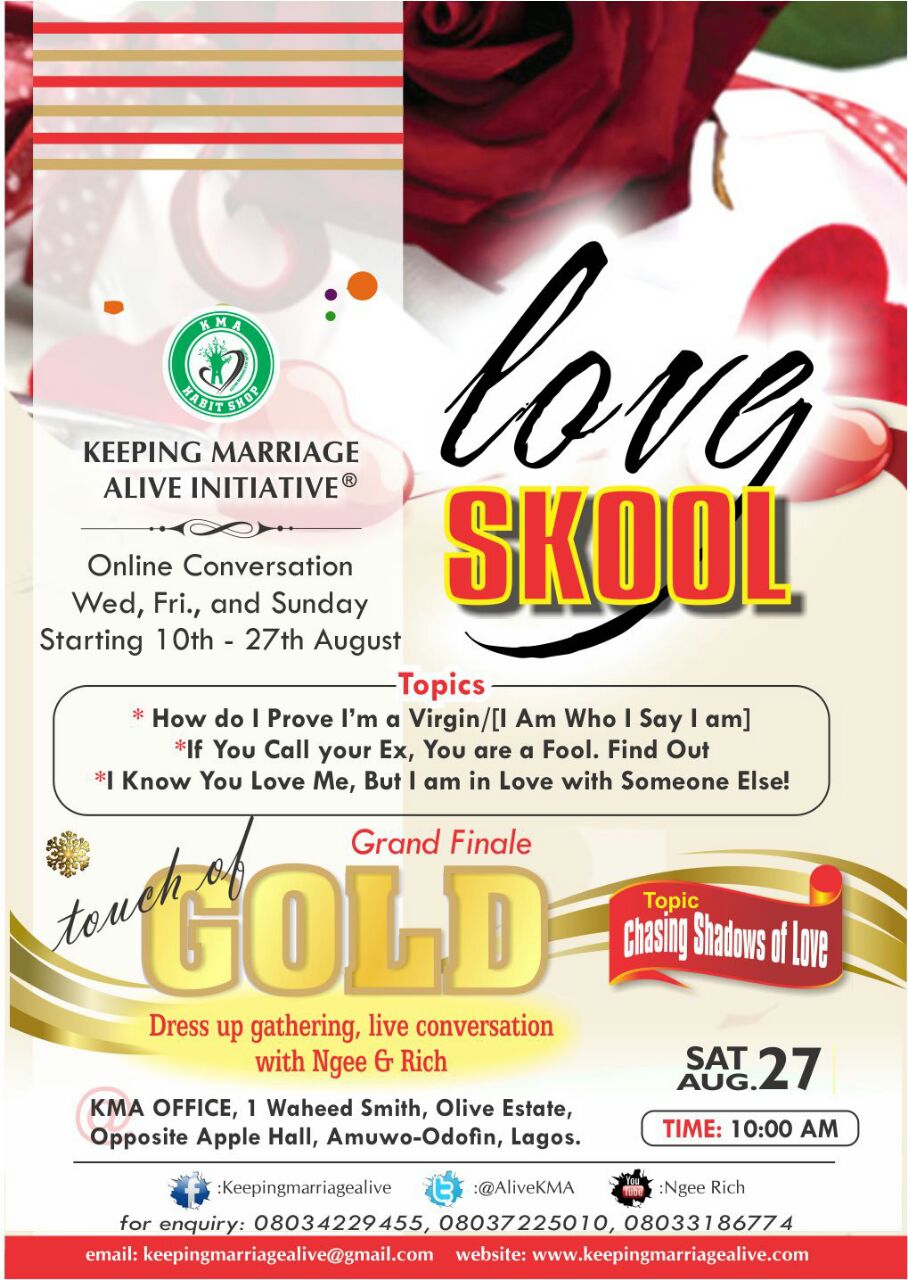TOUCH OF GOLD EVENT #LOVE SKOOL INFORMATION IS POWER! Are you Single? Are you in a relationship? Are you searching for love? Are you loving someone who’s not loving you back? Then this meeting is for you. Join our on going on-line discussions Wednesday, Friday and Saturday as we discuss about #Love. Like our page […]
