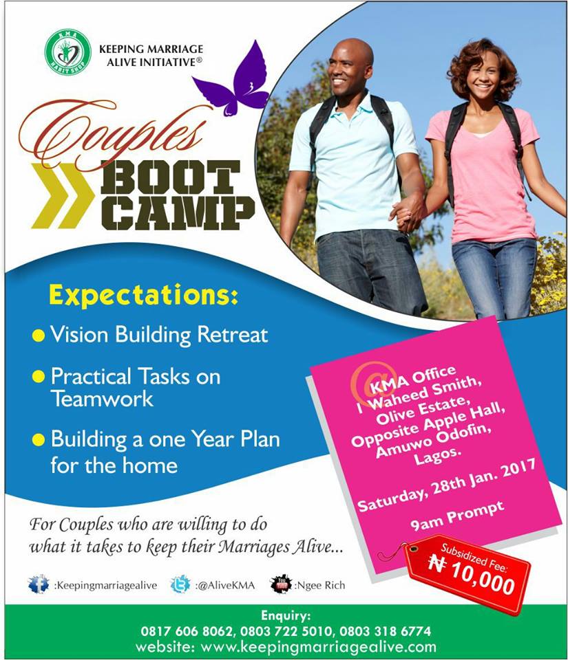 COUPLES BOOT CAMP: A 1day boot camp for Couples who are willing to do what it takes to keep their marriages alive.. ACHIEVABLE GOALS: 1)Understanding and appreciating why you both are together. 2)Learning to maximize your strengths and minimize your weaknesses, using the #TeamWork tool.. 3)Setting a 1year plan that cuts across- #Marriage #Workspace #IndividualGrowth […]