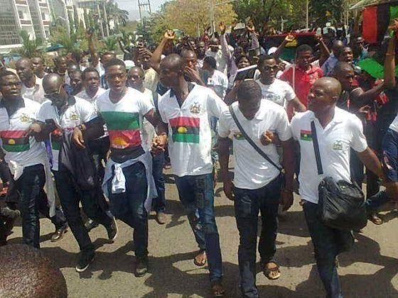 Photos: Pro-Biafrans stage protest in Abuja over their leader Pro-Briafrans staged a protest in Abuja today over what they described as the unlawful detention of Nnamdi Kanu, the director of Radio Biafra and the leader of indigenous people of Biafra. Kanu was arraigned before an Abuja court this morning.